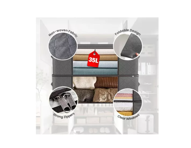 Con este pack de 6 organizadores de bolsas de almacenamiento de 35 litros, podrás mantener tu ropa y textiles perfectamente organizados y protegidos, disfrutando de un hogar más ordenado y limpio.