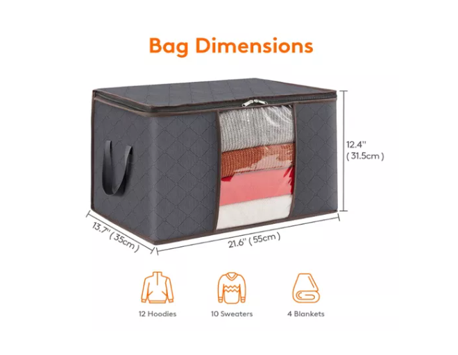 Cada bolsa ofrece una capacidad de 60 litros, suficiente para almacenar hasta 12 sudaderas, 10 suéteres o 4 frazadas, según lo mostrado en la imagen. Es ideal para guardar ropa de temporada, mantas y otros artículos voluminosos.