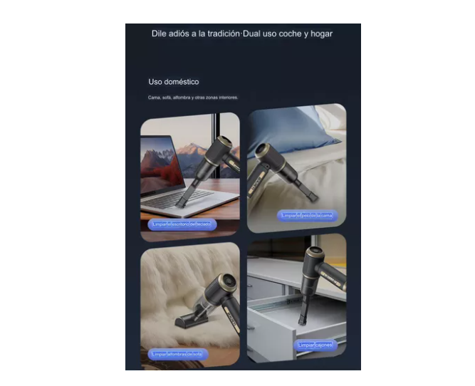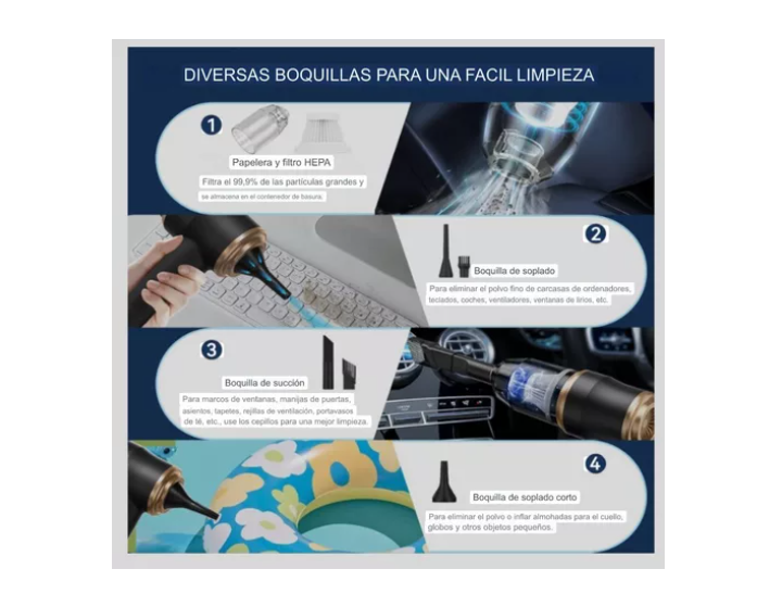 Plumero y aspiradora en uno Puede eliminar fácilmente la suciedad, las migas, el polvo y otras partículas de las superficies, así como eliminar la suciedad pequeña y rebelde escondida en teclados, rincones y recovecos. Aspire el frente y seque la espalda con secador. Tenga en cuenta que diferentes boquillas corresponden a diferentes conexiones en la parte delantera y trasera de la aspiradora.