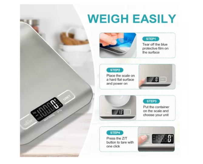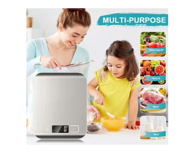 Esta báscula de cocina digital de la marca Genérica es una herramienta esencial para cualquier amante de la cocina. Diseñada para pesar alimentos como la carne, el arroz, el azúcar, la harina, los huevos, la leche, la sal y cualquier otro ingrediente que no supere los 5KG. Su capacidad máxima es de 5 g, lo que la hace ideal para recetas que requieren precisión. Esta báscula tiene una sensibilidad de 0.1 g y es capaz de medir en unidades de gramos, onzas y libras, con un rango de hasta 11 libras (1g-5KG). Fabricada en acero inoxidable plateado, resistente a las huellas dactilares, este modelo de báscula de cocina digital es duradero y fácil de limpiar. Cuenta con una pantalla LCD de alta precisión para una lectura clara y precisa. A pesar de su sofisticada tecnología, es muy fácil de usar gracias a su alimentación a través de una batería AAA incluida. Aunque no incluye recipiente, su diseño compacto y elegante en color plateado se adapta a cualquier estilo de cocina.