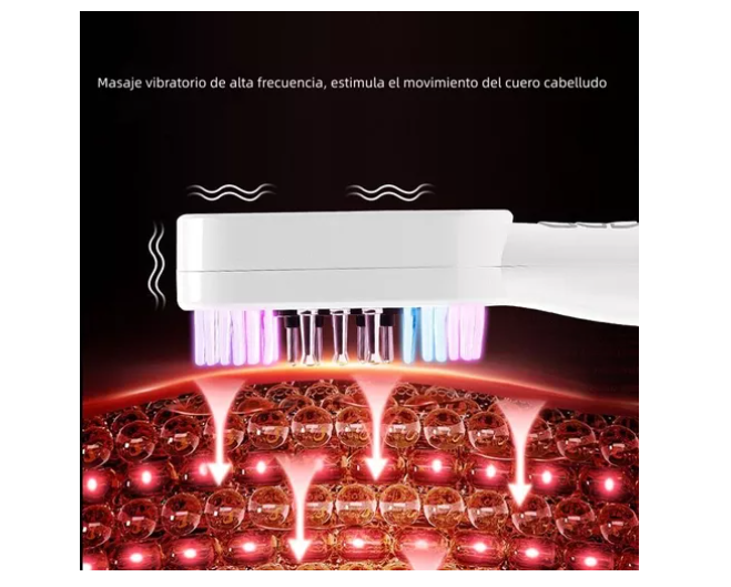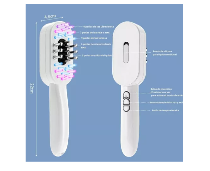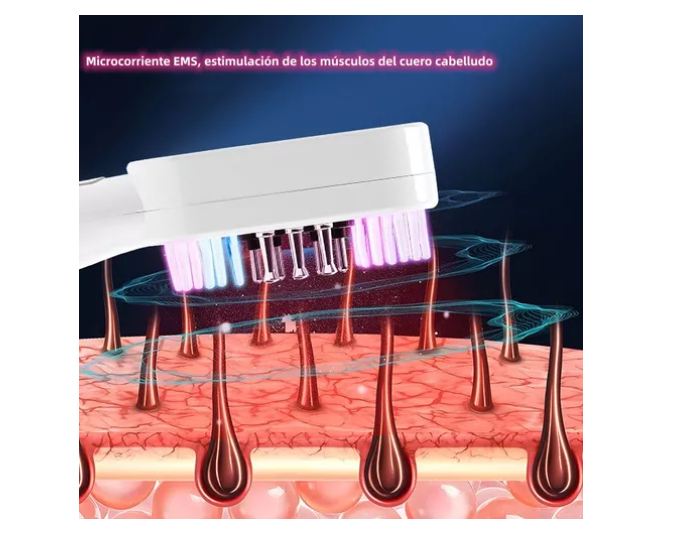 Este innovador cepillo de terapia láser está diseñado para estimular el crecimiento capilar y mejorar la salud del cuero cabelludo mediante una combinación de ondas láser de 655nm, microcorrientes EMS, luz roja y azul, y vibración de alta frecuencia.