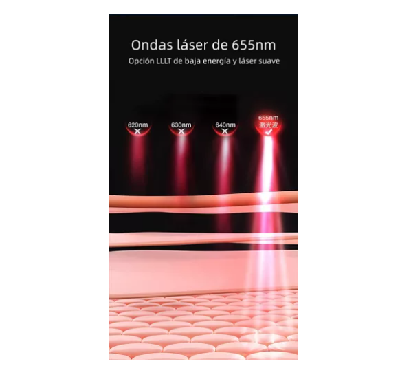 Terapia láser de 655nm: Utiliza luz de baja intensidad (LLLT) para estimular los folículos capilares y mejorar el crecimiento del cabello.