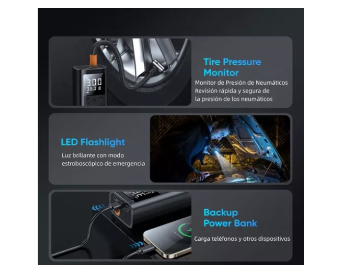 Este compresor de aire portátil inalámbrico es la herramienta ideal para inflar neumáticos de automóviles, motocicletas, bicicletas y otros dispositivos inflables como balones y colchones de aire. Diseñado con una batería de 6000mAh, permite un inflado rápido sin necesidad de cables, proporcionando comodidad y seguridad en cualquier situación.