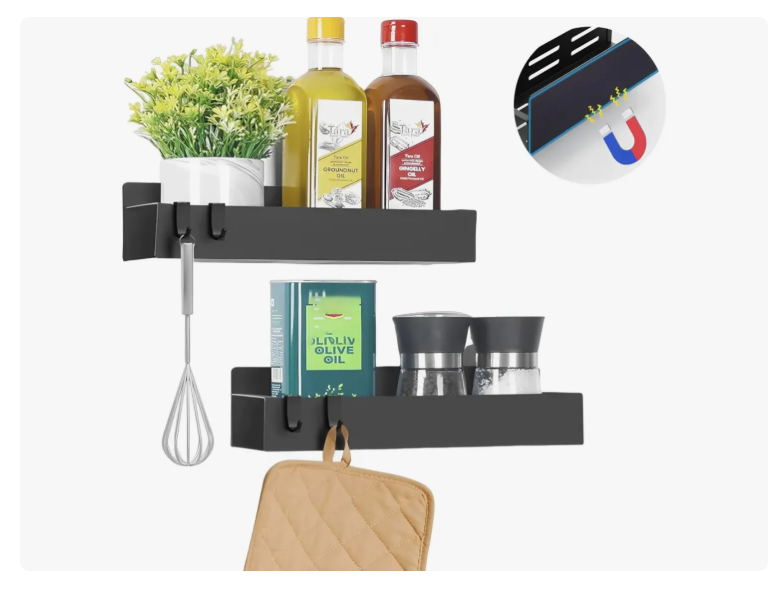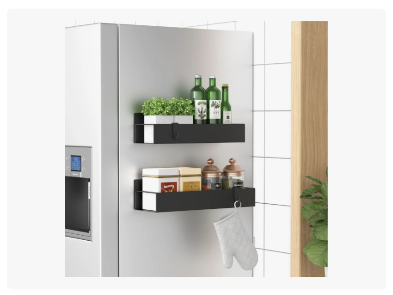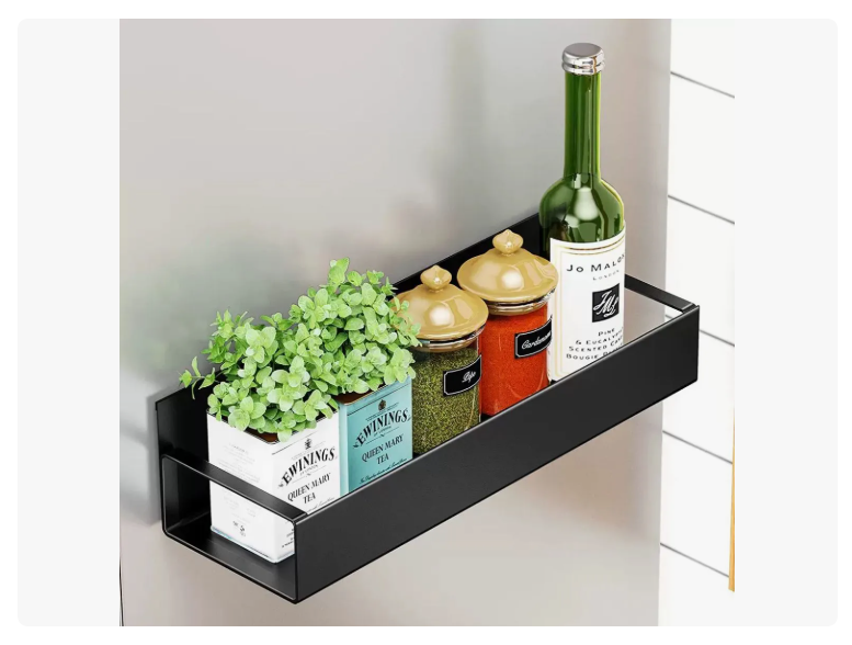 Set x2 Estantes Magnéticos para Refrigerador – Especieros de Cocina Organiza tu cocina de forma práctica y moderna con este set de 2 estantes magnéticos. Perfectos para colocar en el costado del refrigerador, lavadora o cualquier superficie metálica. Ideales para especias, condimentos, frascos, aceites o utensilios. Fijación magnética potente: se adhieren con firmeza sin necesidad de tornillos ni perforaciones. Ahorro de espacio: aprovecha zonas que normalmente no usas. Fácil instalación: solo colócalos y empieza a usarlos al instante. Diseño moderno: estilo minimalista que combina con cualquier cocina. Material resistente: estructura metálica duradera con acabado negro mate. Incluye: • 2 estantes magnéticos • Color: Negro • Material: Metal • Capacidad de carga: 5 kg