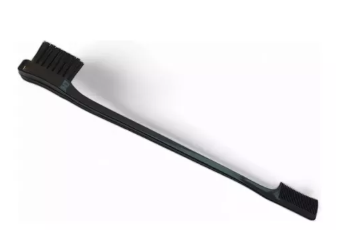 El tercer peine tiene dientes finos en un extremo y un pequeño cepillo en el otro, perfecto para peinar áreas específicas y pulir detalles.
