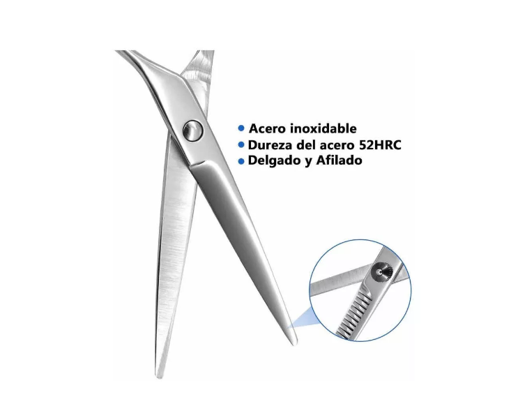 Acero inoxidable Tijera con filo de navaja, posee acabado de manera similar a la hoja de una navaja, con capacidad de afeitar. Esta característica facilitaría que el corte sea más suave y garantiza que sus cuchillas tengan mayor duración.