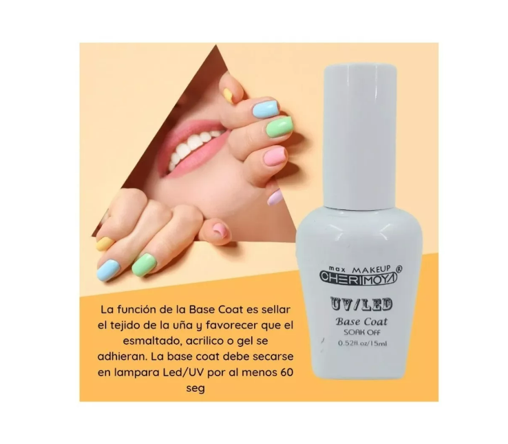 Base 15ml: Es una Base Coat para esmaltado permanente. Corresponde a la primera capa que ayuda a fijar el color de Esmaltes Profesionales Gel (permanente). Seca con Luz UV o LED.