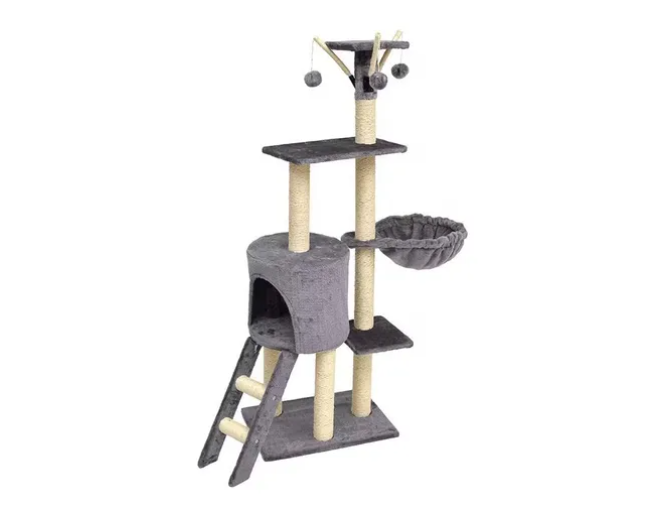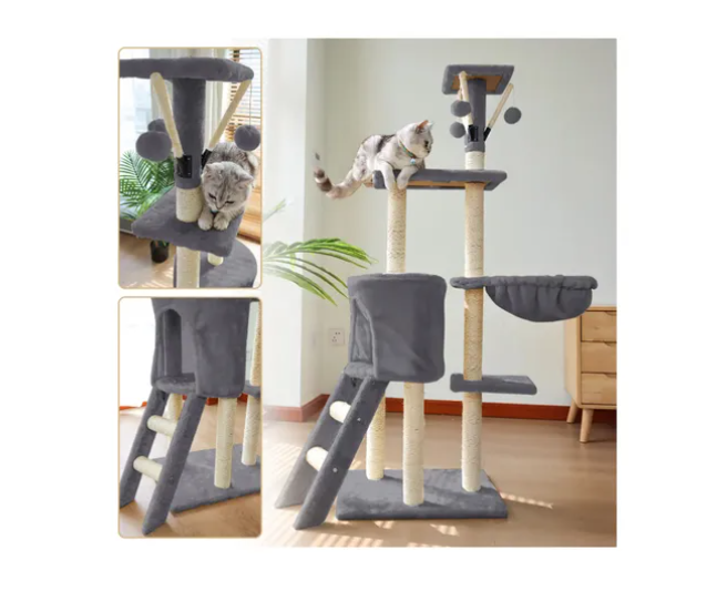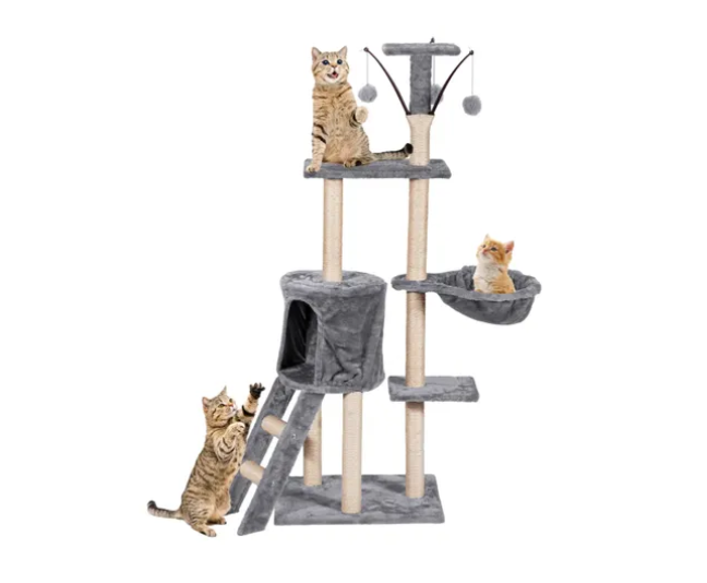 3. Torre de lujo para gatos de cuatro niveles: con cuatro niveles de plataformas, este apartamento para gatos ofrece un amplio espacio para que sus gatos trepen, jueguen y descansen, promoviendo su bienestar físico y mental.